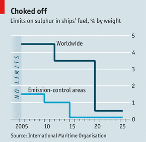 "Ships used to burn the cheap, unrefined crud, laden with sulphur and other nasties, that is left over when oil is refined. The fine soot that such fuel gives off can cause premature deaths from asthma and heart attacks. So in 2005 the IMO started to limit the sulphur content of maritime fuel, especially in “emission-control areas” along heavily populated coasts in North America and Europe. These limits are set to be tightened drastically (see chart). Ships will have to start burning better grades of fuel, similar to diesel.